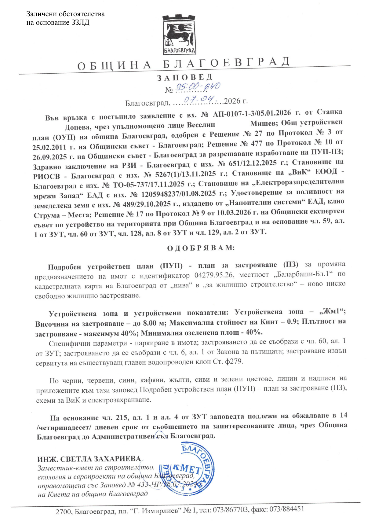 Благоевград | Заповед № 95-00-640/07.04.2026 за одобряване на ПУП GovAlert.eu/2CZn [PDF]