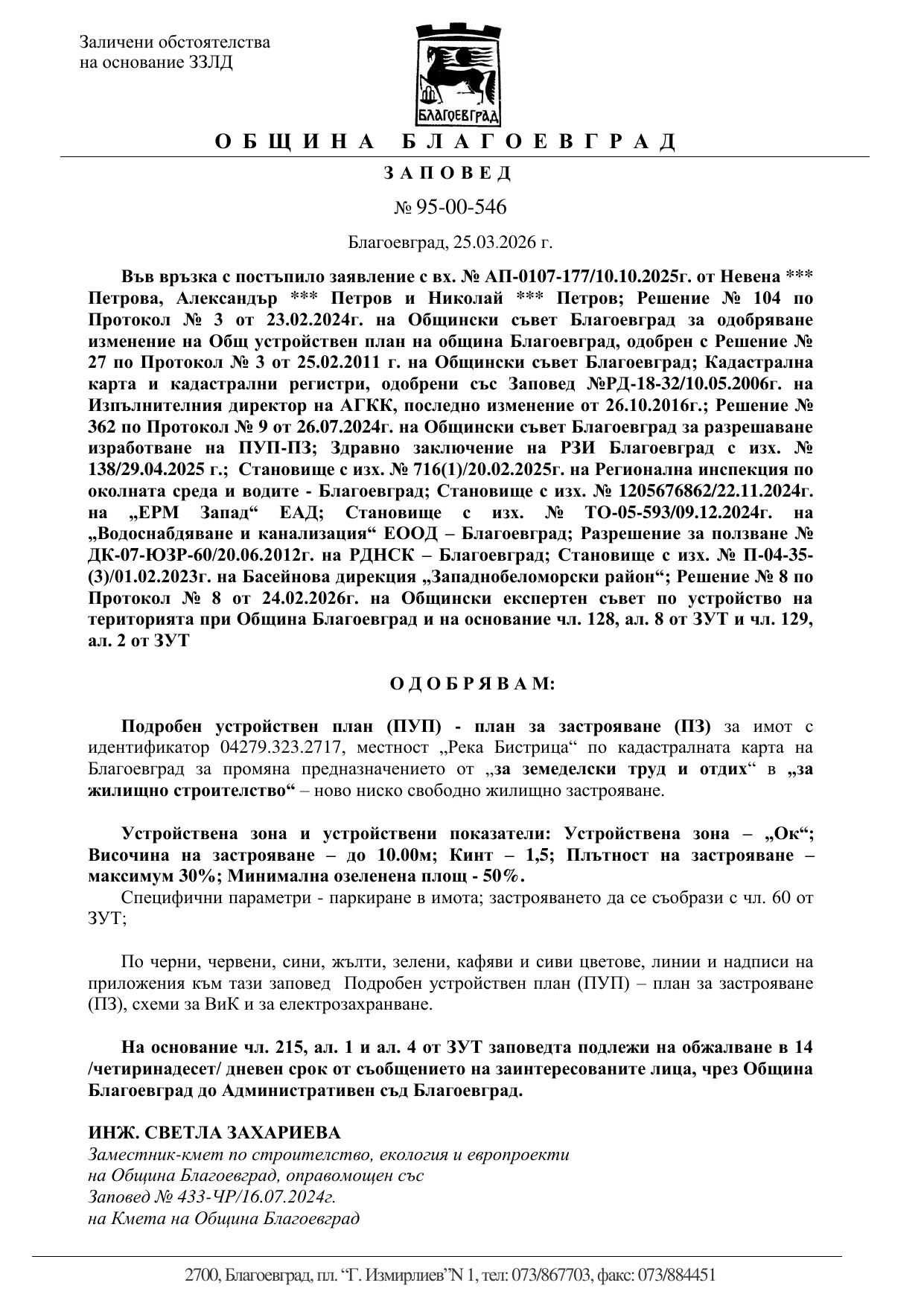 Благоевград | Заповед № 95-00-546/23.03.2026 за одобряване на ПУП GovAlert.eu/2CI9 [PDF]